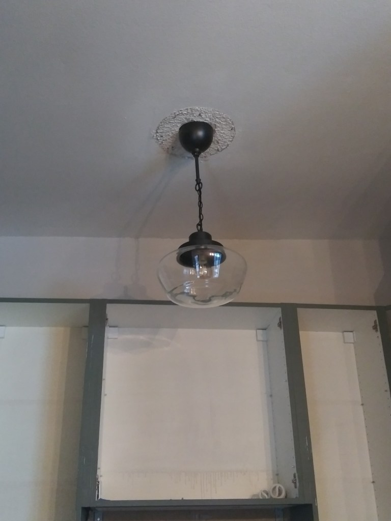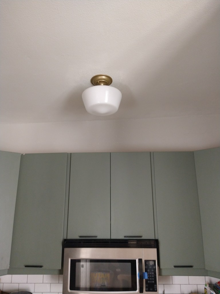 The ceilings are soo high so I needed something bright but I didn’t have much of a budget so I went with a simple school house light. The first one I pick out was clear glass but it was not nearly bright enough and I hated it. The next one I painted the base gold and the glass was white and it was was way brighter!