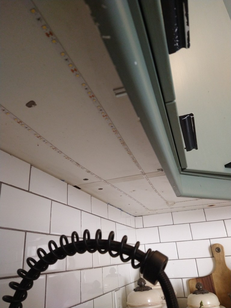 My second fix has been amazing. I took an led light strip and ran it under the cabinet and doubled back so it was bright enough. This plugs and has a button to turn off and on so I am not constantly changing out batteries. I only did one side of my kitchen because I don’t use the other side for anything other than storage.