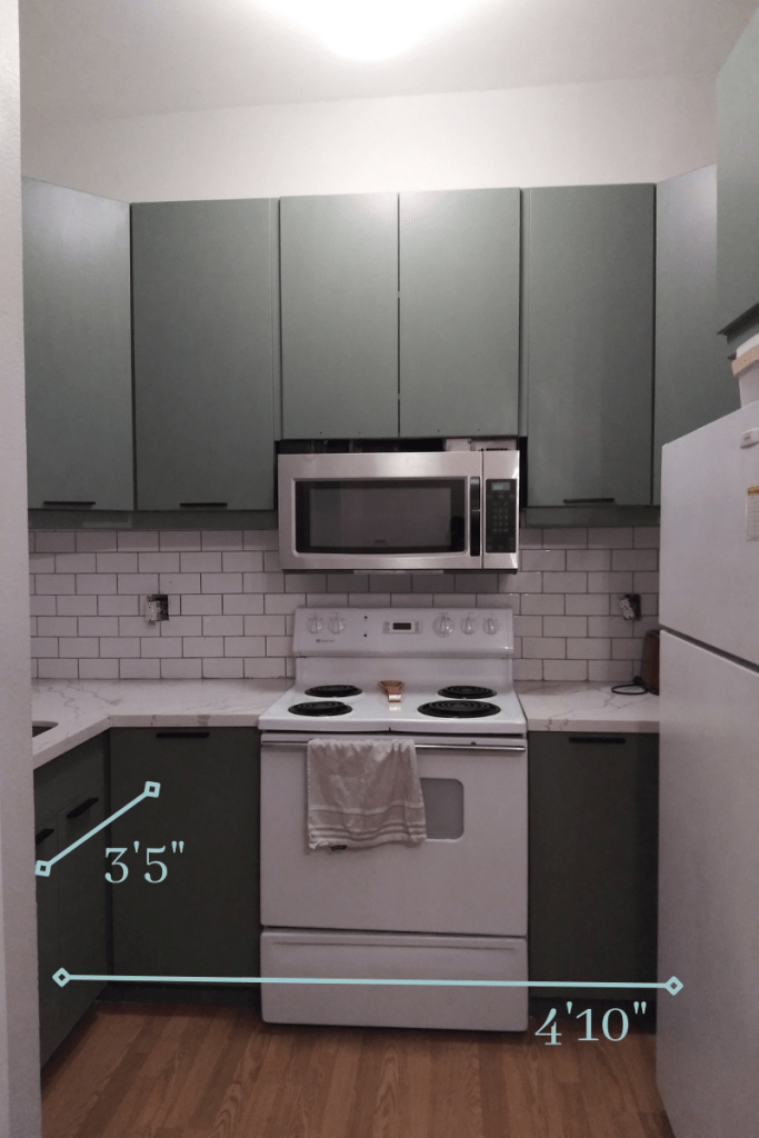 I wanted some color in the apartment and I loved the blue green cabinets that were on trend for 2019. The dark blue green would look so good with the white quartz counter top that we picked out and the classic white subway tile and the white appliances.