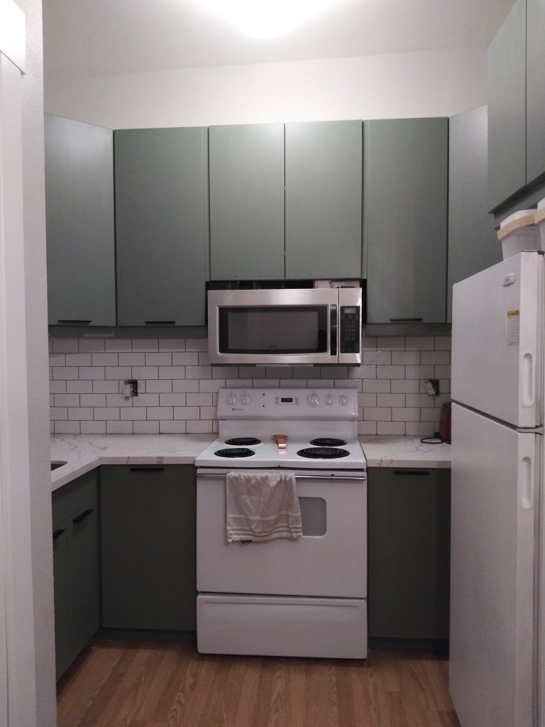 I wanted some color in the apartment and I loved the blue green cabinets that were on trend for 2019. The dark blue green would look so good with the white quartz counter top that we picked out and the classic white subway tile and the white appliances.