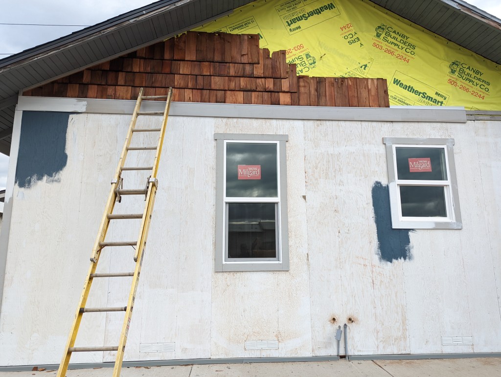 Also – I had no idea there were going to be shakes above the board and batten siding. Gorgeous cedar shakes – painted! Please no! I think there has been a change of heart to keep those natural which would look great with the blue or green and some white trim.